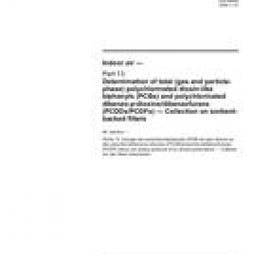 ISO 16000-13:2008 specifies sampling and preparation of sampling media for dioxin-like polychlorinated biphenyls (PCBs), polychlorinated dibenzo-p-dioxins (PCDDs) and polychlorinated dibenzofurans (PCDFs) in indoor air. The method incorporates a sampling procedure that collects PCBs and PCDFs/PCDDs from air on a fine-particle filter backed up by a sorbent trap. The method cannot be used to separately determine gaseous PCBs and PCDFs/PCDDs and those that are particle-associated because some of the compounds will volatilize from the filter and be collected by the sorbent trap. ISO 16000-13:2008 does not address analytical methods for PCBs, PCDDs and PCDFs, which are included in ISO 16000-14.