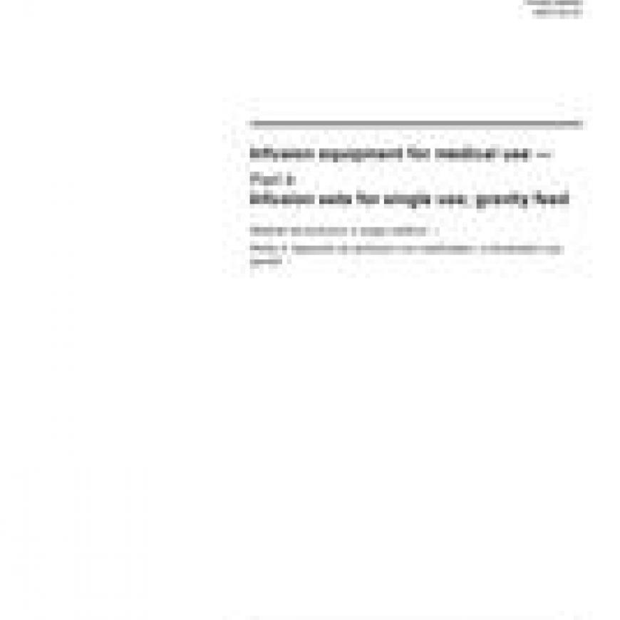 ISO 8536-4:2007 specifies requirements for single-use, gravity feed infusion sets for medical use in order to ensure their compatibility with containers for infusion solutions and intravenous equipment.