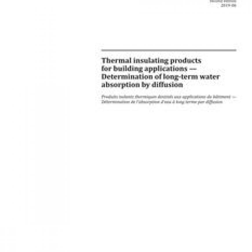 ISO 16536:2019 specifies the equipment and procedures for determining the long-term water absorption of test specimens by diffusion. It is applicable to thermal insulating products. It is intended to simulate the water absorption of products subjected to high relative humidities, approximating to 100 %, on both sides and subjected to a water vapour pressure gradient for a long period of time e.g. inverted roof or unprotected ground insulation.