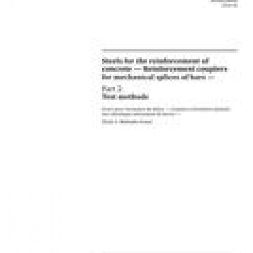 ISO 15835-2:2018 specifies test methods applicable to couplers for mechanical splices of steel reinforcing bars.