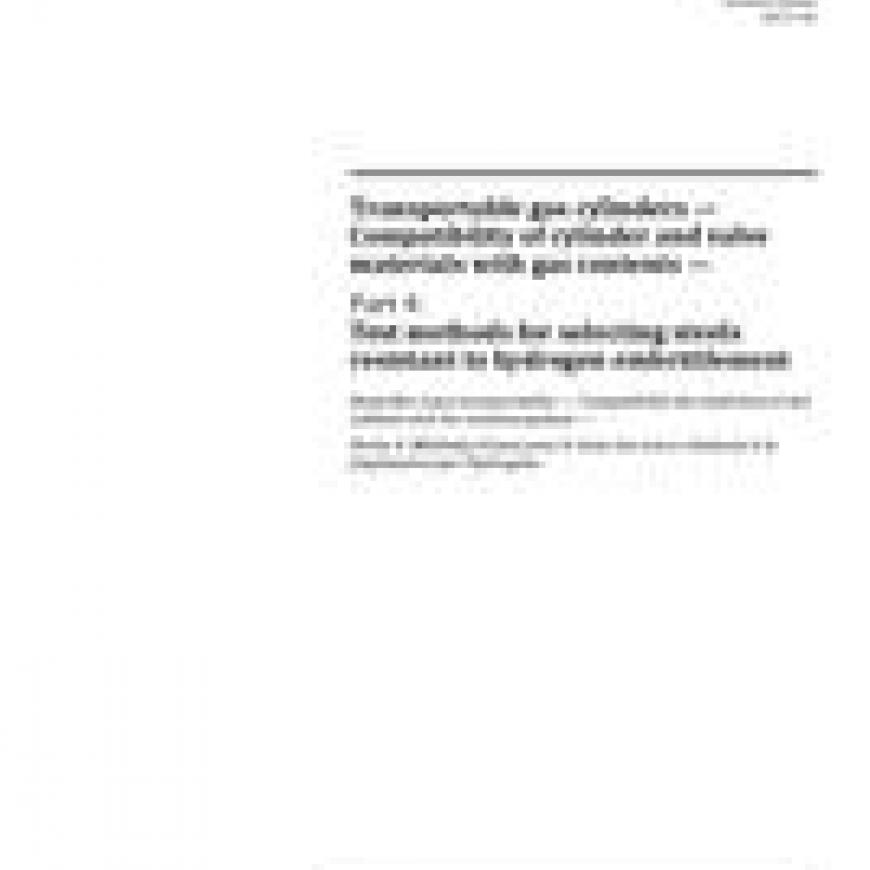 ISO 11114-4: 2017 specifies test methods and the evaluation of results from these tests in order to qualify steels suitable for use in the manufacture of gas cylinders (up to 3 000 l) for hydrogen and hydrogen bearing embrittling gases.