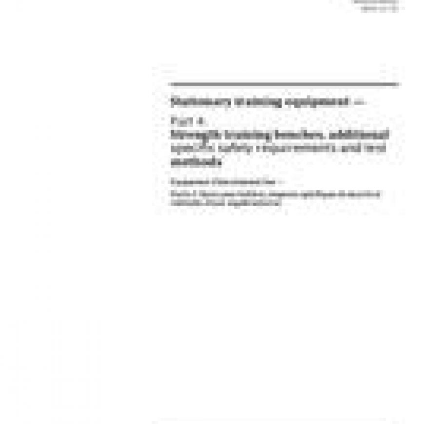 ISO 20957-4:2016 specifies safety requirements for stationary strength training benches and free-standing barbell racks in addition to the general safety requirements of ISO 20957-1. It is intended to be read in conjunction with ISO 20957-1.