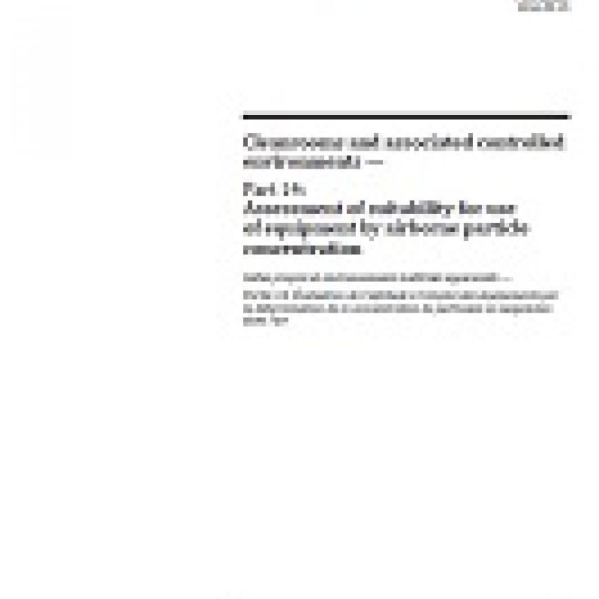 ISO 14644-14:2016 specifies a methodology to assess the suitability of equipment (e.g. machinery, measuring equipment, process equipment, components and tools) for use in cleanrooms and associated controlled environments, with respect to airborne particle cleanliness as specified in ISO 14644-1. Particle sizes range from 0,1 µm to equal to or larger than 5 µm (given in ISO 14644-1).