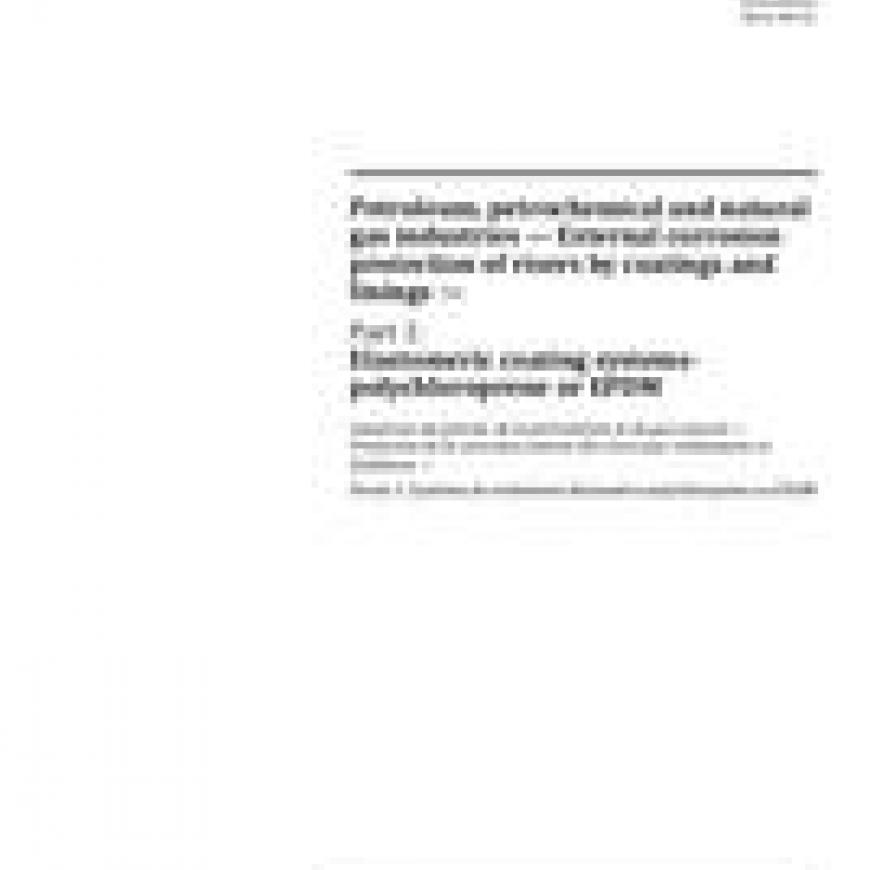 ISO 18797-1:2016 specifies the minimum requirements for materials selection, surface preparation, application, inspection, testing, qualification and acceptance criteria of external coating for steel risers pipes used in the splash zone, their field joints and clamps/guides, using an elastomeric protective coating based on polychloroprene, EPDM or equivalent. This is applicable for new construction and repair of applied pipes before installation. Maintenance requirements and field repairs are covered in ISO 18797-2.