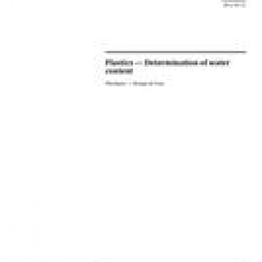 ISO 15512:2014 specifies methods for the determination of the water content of plastics in the form of powder, granules, and finished articles. These methods do not test for water absorption (kinetics and equilibrium) of plastics as measured by ISO 62.