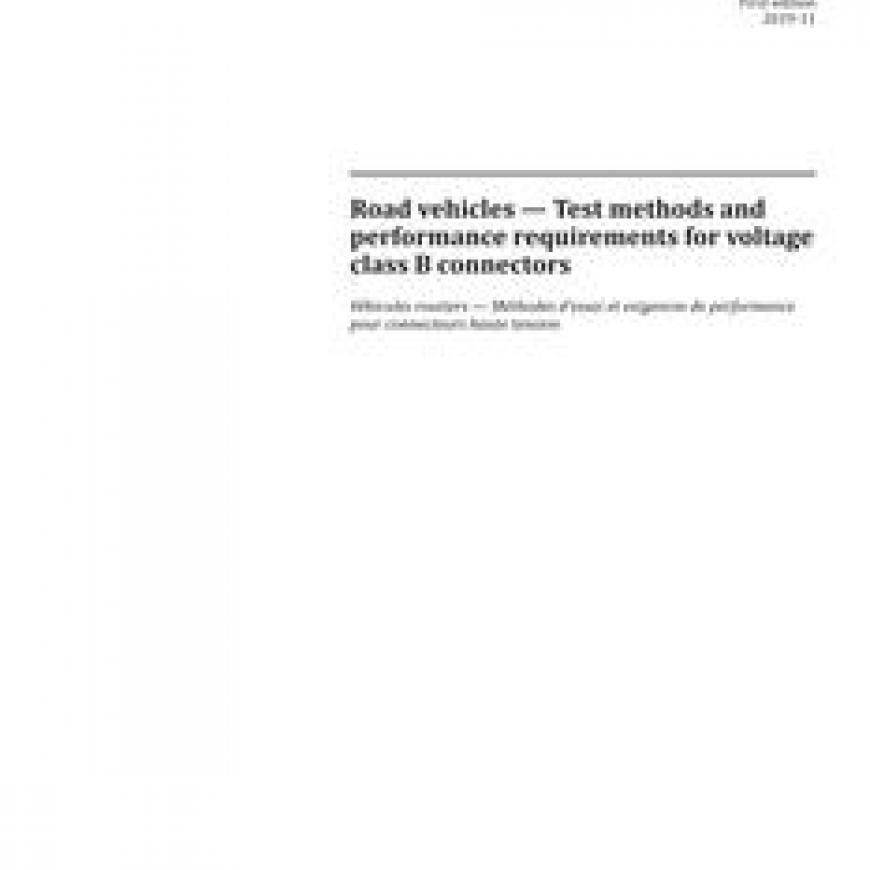 ISO 20076:2019 defines terms and specifies test methods for general performance requirements of voltage class B connectors with single-pole and multi-pole connections used with electrical wiring harnesses of road vehicles.