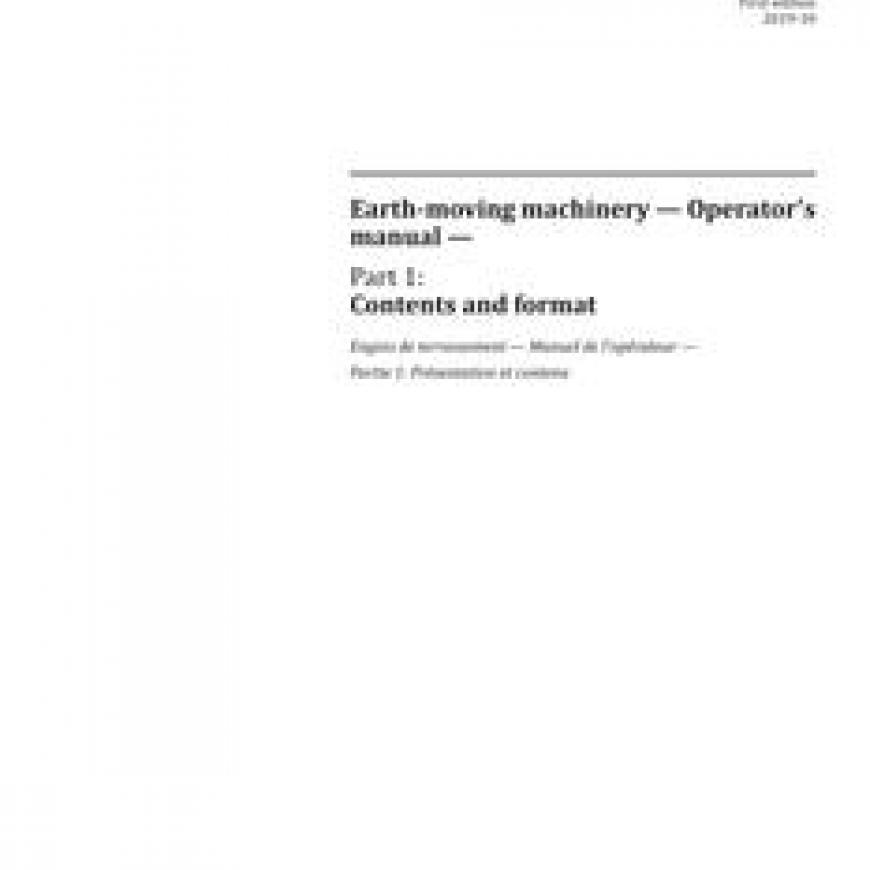 ISO 6750-1:2019 specifies the contents of operator's manuals for earth-moving machinery as defined in ISO 6165, and gives guidance on how to structure such operator's manuals. It is intended to assist manufacturers of the machinery in the drafting and presentation of these manuals.