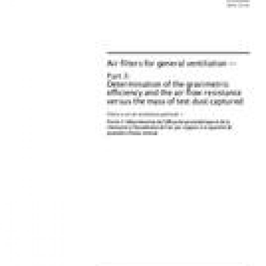 ISO 16890-3:2016 specifies the test equipment and the test methods used for measuring the gravimetric efficiency and resistance to air flow of air filter for general ventilation.