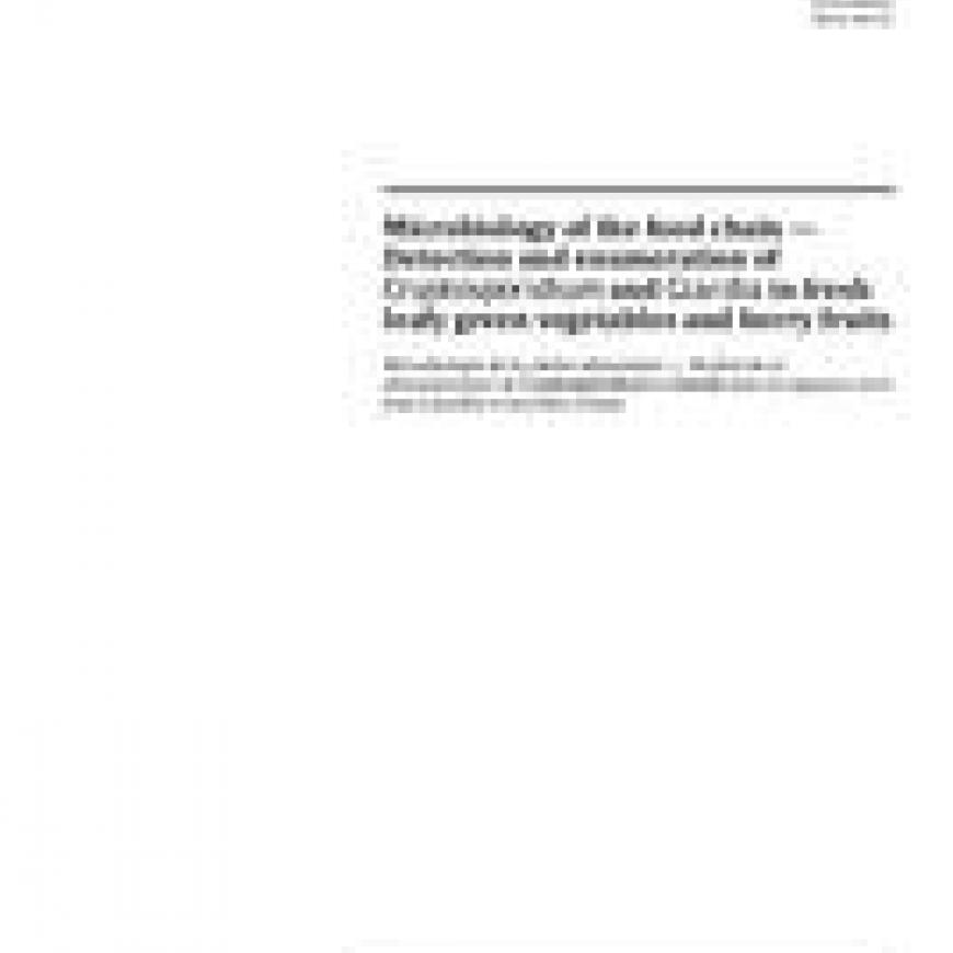ISO 18744:2016 specifies a method that is applicable for the detection and enumeration of Cryptosporidium oocysts and Giardia cysts on or in food products that are described herein as fresh leafy green vegetables and berry fruits. With suitable controls, it may also be applicable for the examination of other fresh produce.