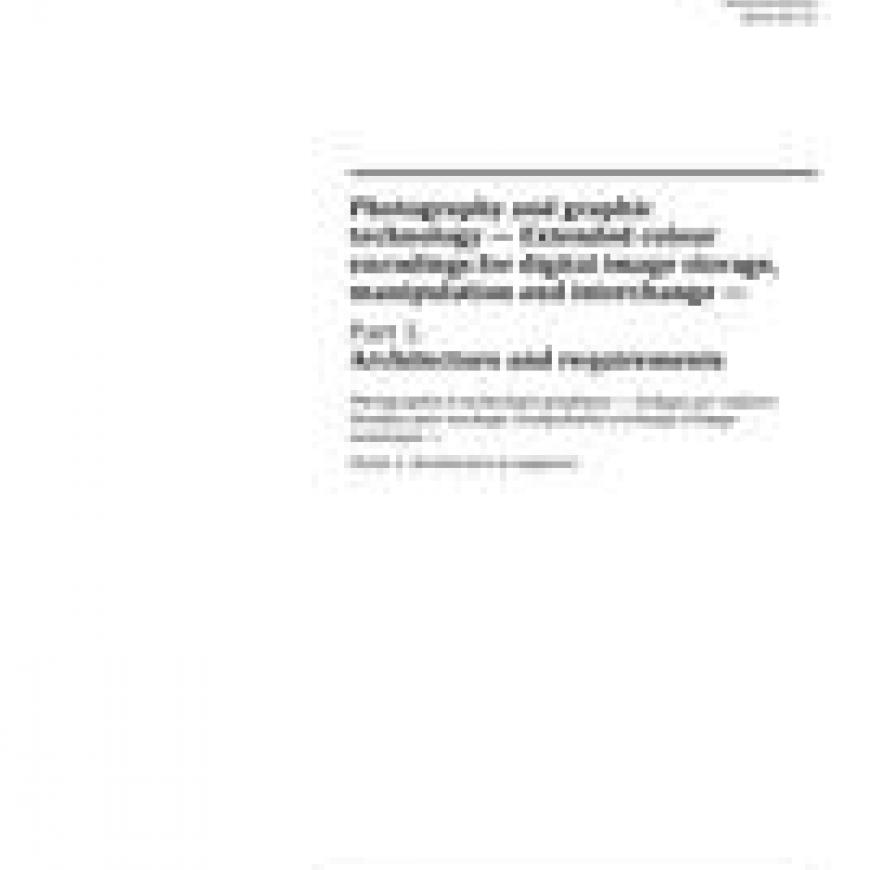 ISO 22028-1:2016 specifies a set of requirements to be met by any extended-gamut colour encoding that is to be used for digital photography and/or graphic technology applications involving digital image storage, manipulation and/or interchange. This part of ISO 22028 is applicable to pictorial digital images that originate from an original scene, as well as digital images with content such as text, line art, vector graphics and other forms of original artwork. This part of ISO 22028 also describes a reference image-state-based digital imaging architecture, encompassing many common workflows, that can be used to classify extended colour encodings into a number of different image states. However, this part of ISO 22028 does not specify any particular workflow(s) that are to be used for digital photography and/or graphic technology applications.