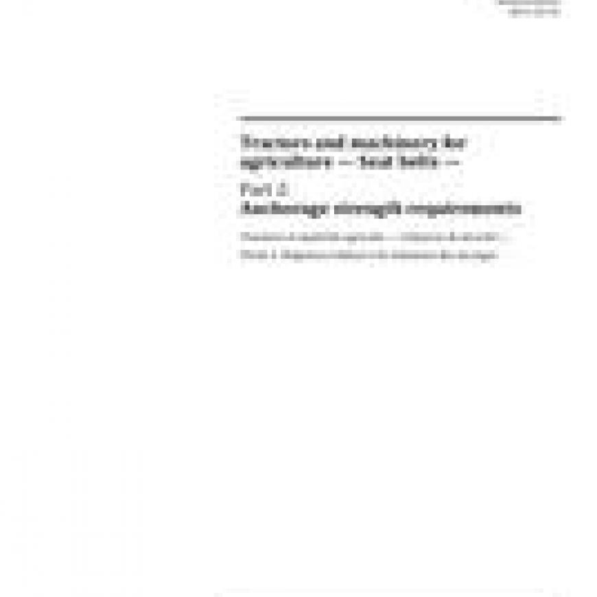 ISO 3776-2:2013 specifies the strength requirements of the anchorages for pelvic restraint (seat) belts intended to be used by the operators of agricultural tractors and self-propelled machinery.