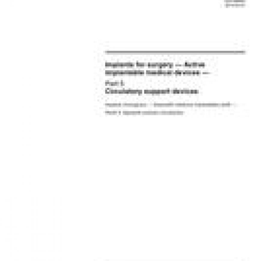 ISO 14708-5:2010 specifies requirements for safety and performance of active implantable circulatory support devices. It is not applicable to extracorporeal perfusion devices, cardiomyoplasty, heart restraint devices and counter-pulsation devices, such as extra- or intra-aortic balloon pumps.