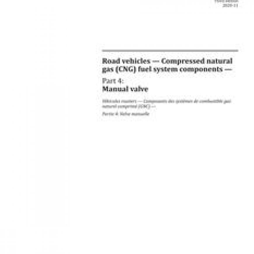 ISO 15500-4:2020 specifies tests and requirements for the manual valve, a compressed natural gas (CNG) fuel system component intended for use on the types of motor vehicles defined in ISO 3833.