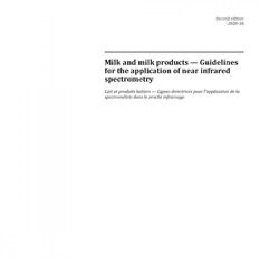 ISO 21543:2020 gives guidelines for the use of near infrared (NIR) spectrometry in the analysis of milk and milk products in liquid, semi-solid or solid form. Depending on the sample form and application, different instrument setups for transmittance, diffuse reflectance or transflectance can be applied.