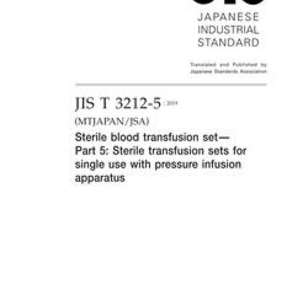 JIS T 3212-5:2019 specifies requirements for sterile single-use transfusion sets with pressure infusion apparatus capable of generating pressures up to 200 kPa {2 bar}. It can also be employed to ensure compatibility of such transfusion sets with containers for blood and blood components as well as with intravenous equipment.