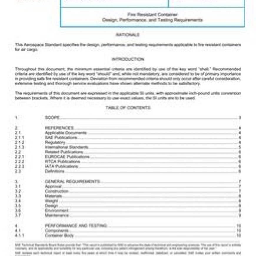 This Aerospace Standard (AS) specifies the minimum design and performance criteria and testing methods of passive fire resistant containers (FRCs) used either: