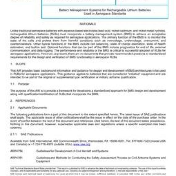 This AIR provides basic background information and guidance for design and development of BMS architectures to be used in RLBs for aerospace applications. This guidance applies to batteries that are considered ¿¿¿installed¿¿¿ equipment and are intended to be part of the original or supplemental type certification or military airframe qualification.