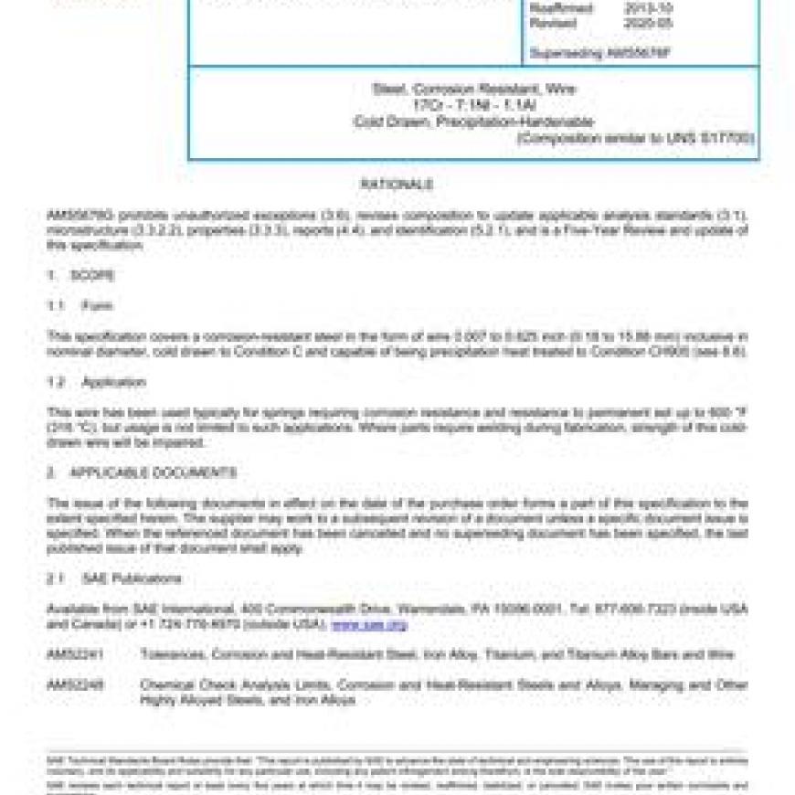 SAE AMS5678G Steel, Corrosion Resistant, Wire 17Cr - 7.1NI - 1.1Al Cold Drawn, Precipitation-Hardenable