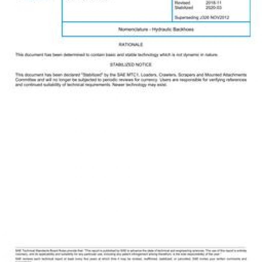This SAE standard includes hydraulic backhoes which have no more than 190 degrees of rotational swing and are mounted on wheeled tractors and crawler tractors. Illustrations used are not intended to include all existing commercial machines or to be exact descriptions of any particular machine. The illustrations have been chosen to describe the principles to be used in applying this standard.