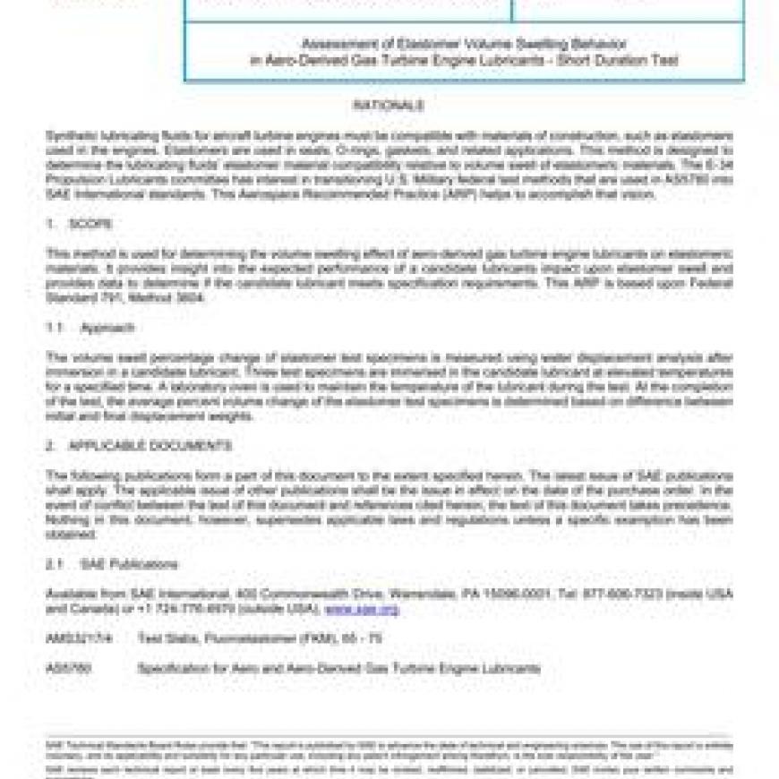 This method is used for determining the volume swelling effect of aero-derived gas turbine engine lubricants on elastomeric materials. It provides insight into the expected performance of a candidate lubricants impact upon elastomer swell and provides data to determine if the candidate lubricant meets specification requirements. This ARP is based upon Federal Standard 791, Method 3604.