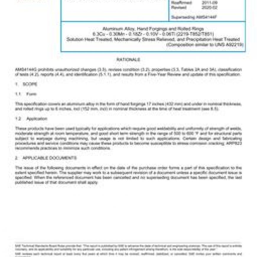 SAE AMS4144G Aluminum Alloy, Hand Forgings and Rolled Rings 6.3Cu - 0.30Mn - 0.18Zr - 0.10V - 0.06Ti (2219-T852/T851) Solution Heat Treated, Mechanically Stress Relieved, and Precipitation Heat Treated
