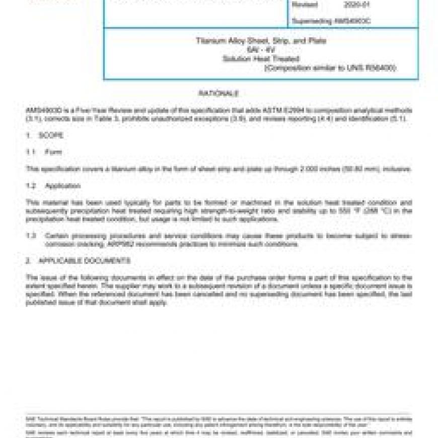 SAE AMS4903D Titanium Alloy Sheet, Strip, and Plate 6Al - 4V Solution Heat Treated