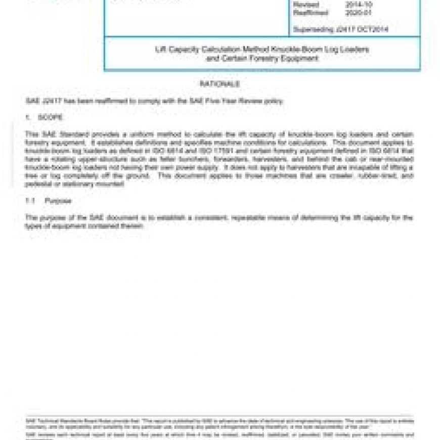 This SAE Standard provides a uniform method to calculate the lift capacity of knuckle-boom log loaders and certain forestry equipment. It establishes definitions and specifies machine conditions for calculations. This document applies to knuckle-boom log loaders as defined in ISO 6814 and ISO 17591 and certain forestry equipment defined in ISO 6814 that have a rotating upper-structure such as feller bunchers, forwarders, harvesters, and behind the cab or rear-mounted knuckle-boom log loaders not having their own power supply. It does not apply to harvesters that are incapable of lifting a tree or log completely off the ground. This document applies to those machines that are crawler, rubber-tired, and pedestal or stationary mounted.