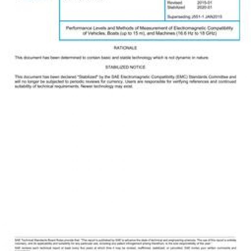 This SAE Standard covers the measurement of radio frequency radiated emissions and immunity. Each part details the requirements for a specific type of electromagnetic compatibility (EMC) test and the applicable frequency range of the test method. The methods are applicable to a vehicle, boat, machine or device powered by an internal combustion engine or battery powered electric motor. Operation of all engines or motors (main and auxiliary) of a vehicle, boat, machine or device is included. All equipment normally operating when the vehicle, boat, machine or device is in operation is included. Operator controlled equipment is included or excluded as specified in the individual document parts. As a special case, CISPR 12 applies to battery powered floor finishing equipment, but robot carpet sweepers are excluded. By reference, IEC CISPR 12 and CISPR 25 are adopted as the standards for the measurement of vehicle emissions. In the event that an amendment is made or a new edition is published, the new IEC document shall become part of this standard six months after the publication of the IEC document. SAE reserves the right to identify exceptions to the published IEC documents with the exceptions to be documented in SAE J551-2 and SAE J551-4, respectively. Also by reference, ISO 11451-2, ISO 11451-3 and ISO 11451-4 are adopted as standards for the measurement of vehicle immunity. In the event that an amendment is made or a new edition is published, the new ISO document shall become part of this standard six months after the publication of the ISO document. SAE reserves the right to identify exceptions to the published ISO documents with the exceptions to be documented in SAE J551-11, SAE J551-12 and SAE J551-13, respectively. The recommended levels apply only to complete vehicles in their final manufactured form. Vehicle-mounted rectifiers used for charging in electric vehicles are included in this series of documents when operated in their charging mode. Emissions from intentional radiators are not controlled by this document. (See applicable, appropriate regulatory documents.) The immunity of commercial mains powered equipment to over voltages and line transients is not covered by this document.