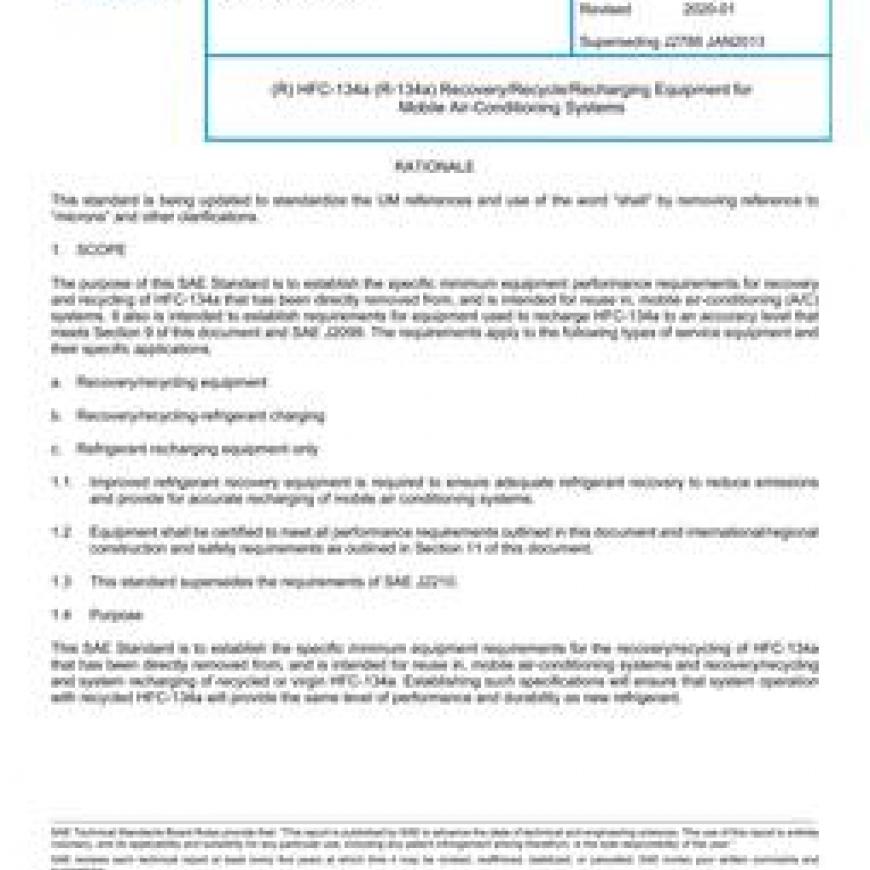 The purpose of this SAE Standard is to establish the specific minimum equipment performance requirements for recovery and recycling of HFC-134a that has been directly removed from, and is intended for reuse in, mobile air-conditioning (A/C) systems. It also is intended to establish requirements for equipment used to recharge HFC-134a to an accuracy level that meets