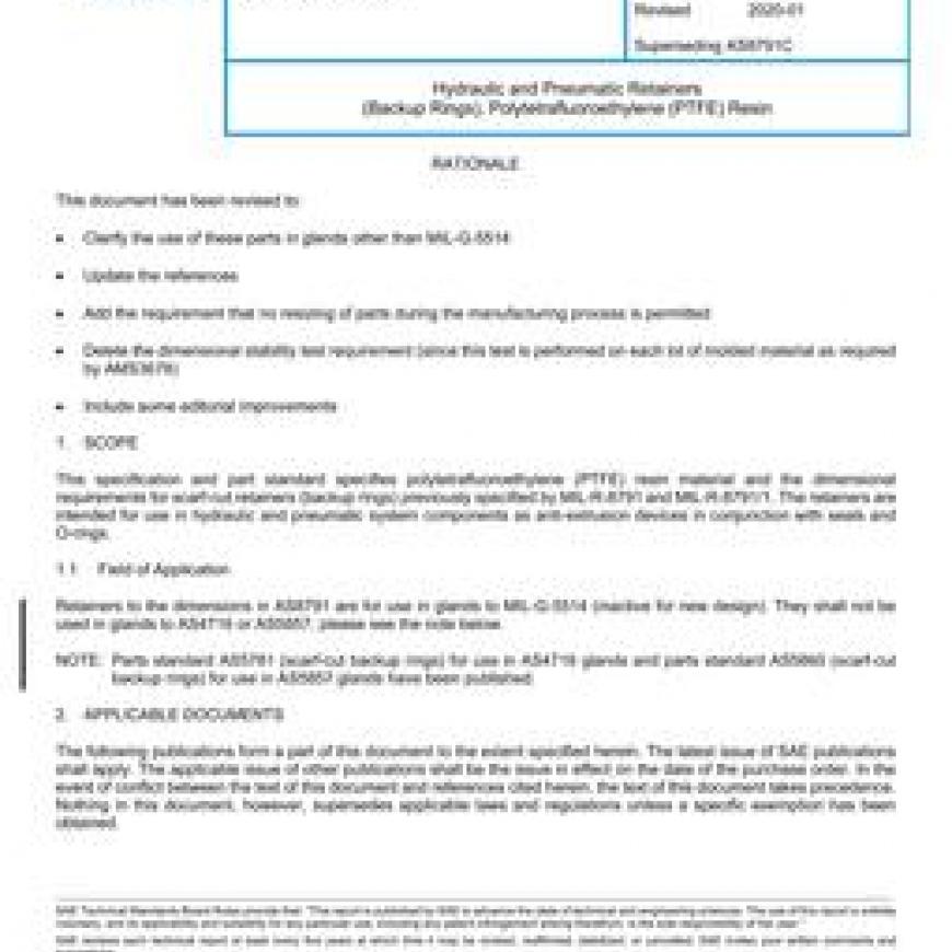This specification and part standard specifies polytetrafluoroethylene (PTFE) resin material and the dimensional requirements for scarf-cut retainers (backup rings) previously specified by MIL-R-8791 and MIL-R-8791/1. The retainers are intended for use in hydraulic and pneumatic system components as anti-extrusion devices in conjunction with seals and O-rings.
