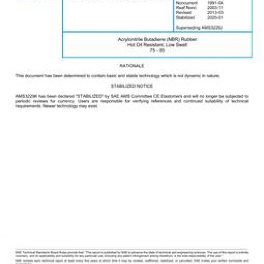 SAE AMS3229K Acrylonitrile Butadiene (NBR) Rubber Hot Oil Resistant, Low Swell 75 - 85 (Stabilized: Jan 2020)