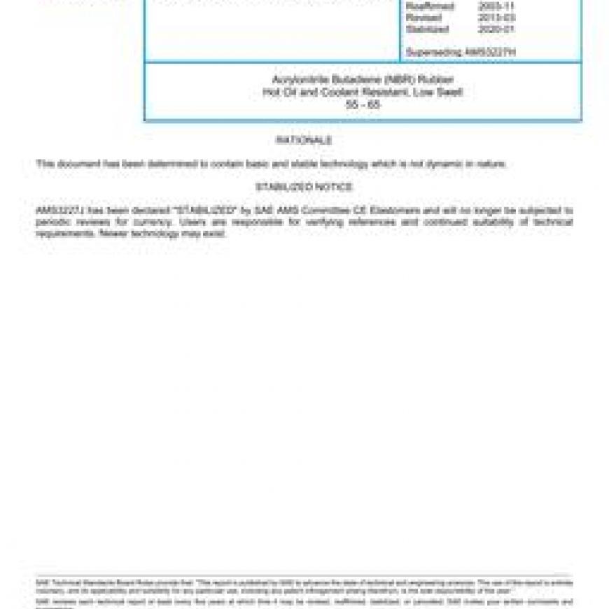 SAE AMS3227J Acrylonitrile Butadiene (NBR) Rubber Hot Oil and Coolant Resistant, Low Swell 55 - 65 (Stabilized: Jan 2020)