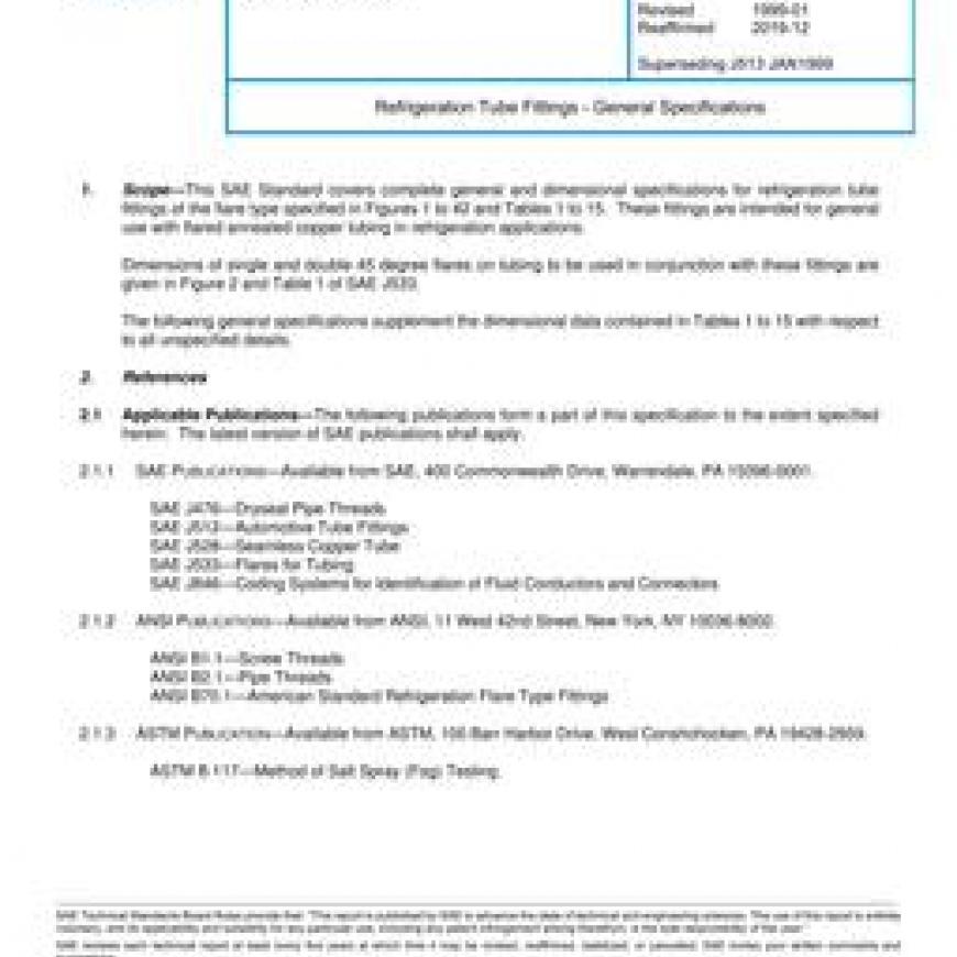 This SAE Standard covers complete general and dimensional specifications for refrigeration tube fittings of the flare type specified in Figures 1 to 42 and Tables 1 to 15. These fittings are intended for general use with flared annealed copper tubing in refrigeration applications. Dimensions of single and double 45 degree flares on tubing to be used in conjunction with these fittings are given in Figure 2 and Table 1 of SAE J533. The following general specifications supplement the dimensional data contained in Tables 1 to 15 with respect to all unspecified details.