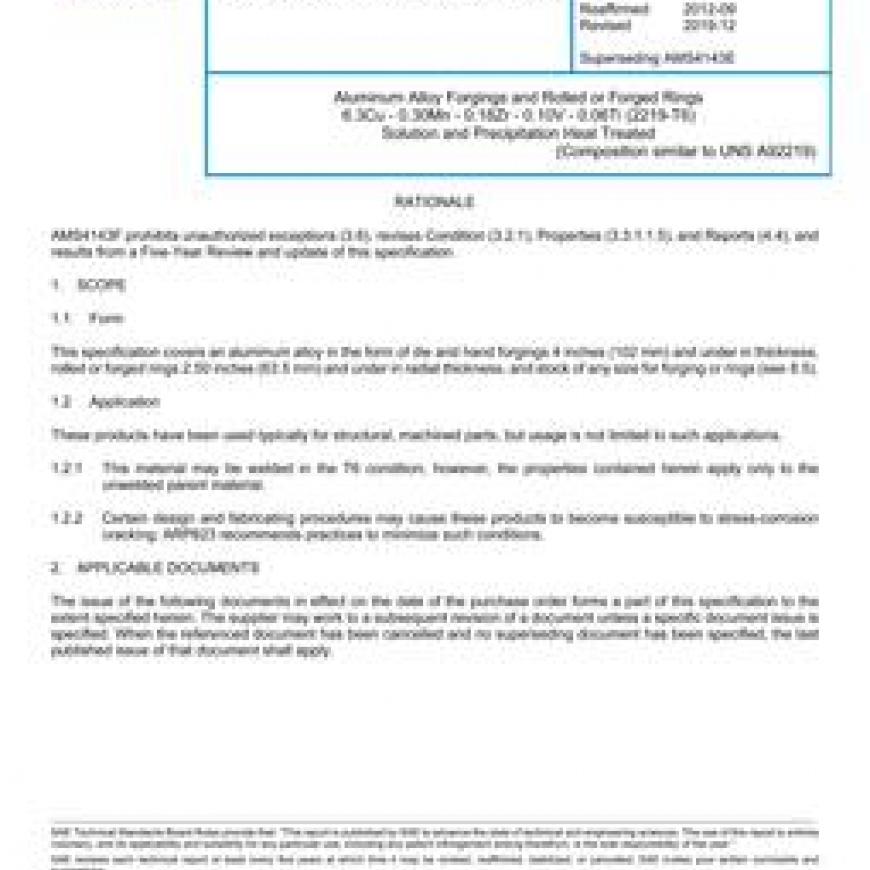 This specification covers an aluminum alloy in the form of die and hand forgings 4 inches (102 mm) and under in thickness, rolled or forged rings 2.50 inches (63.5 mm) and under in radial thickness, and stock of any size for forging or rings (see 8.5).