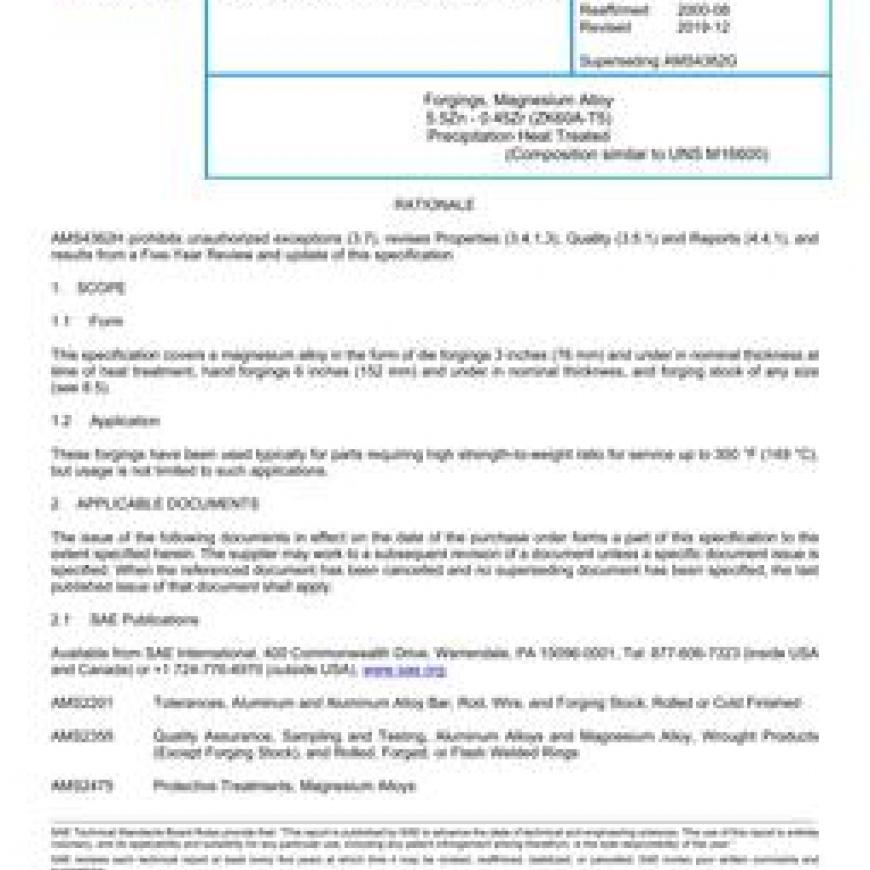 This specification covers a magnesium alloy in the form of die forgings 3 inches (76 mm) and under in nominal thickness at time of heat treatment, hand forgings 6 inches (152 mm) and under in nominal thickness, and forging stock of any size (see 8.5).
