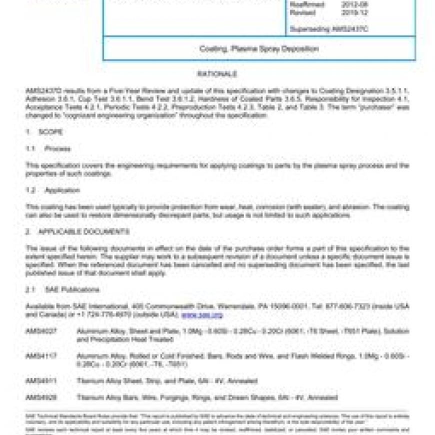 SAE AMS2437D Coating, Plasma Spray Deposition