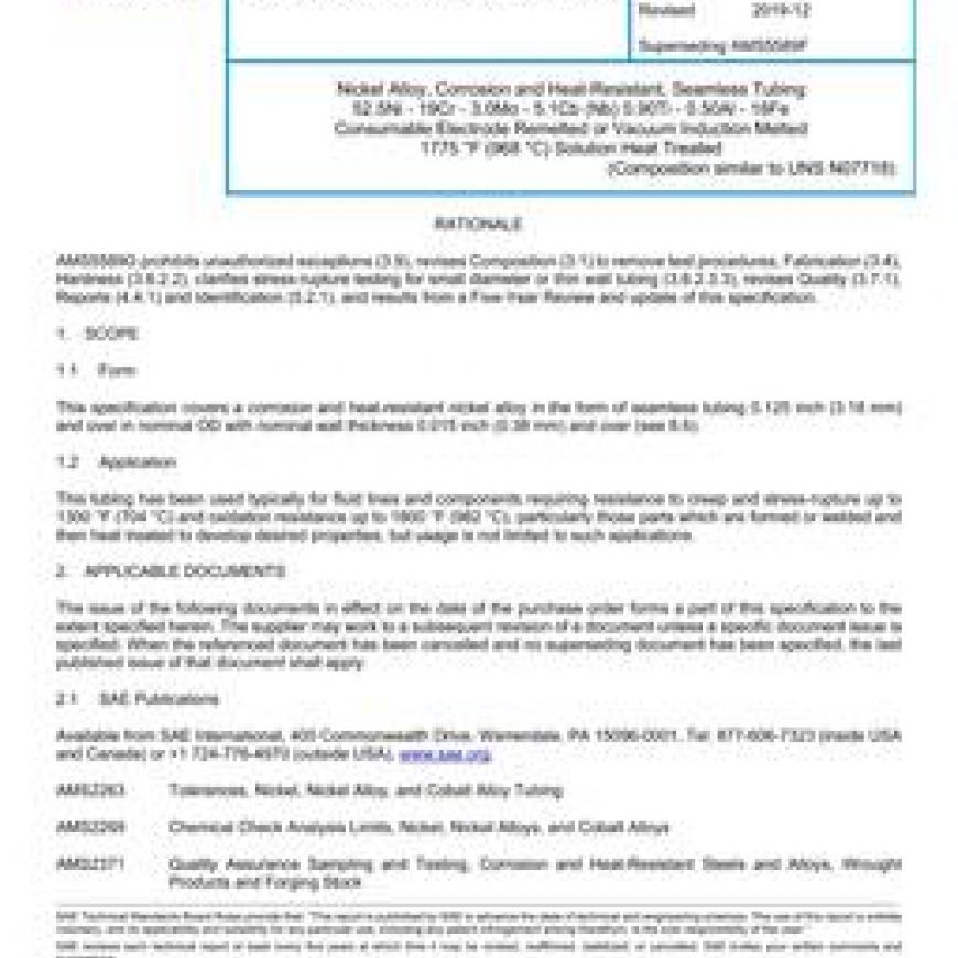 SAE AMS5589G Nickel Alloy, Corrosion and Heat-Resistant, Seamless Tubing 52.5Ni - 19Cr - 3.0Mo - 5.1Cb (Nb) 0.90Ti - 0.50Al - 18Fe Consumable Electrode Remelted or Vacuum Induction Melted 1775 ¿¿F (968 ¿¿C) Solution Heat Treated