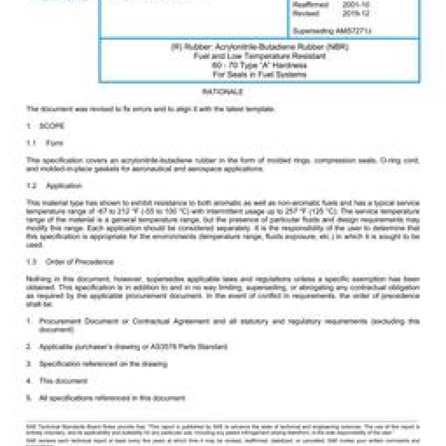 SAE AMS7271K Rubber: Acrylonitrile-Butadiene Rubber (NBR) Fuel and Low Temperature Resistant 60 - 70 Type ¿¿¿A¿¿¿ Hardness For Seals in Fuel Systems