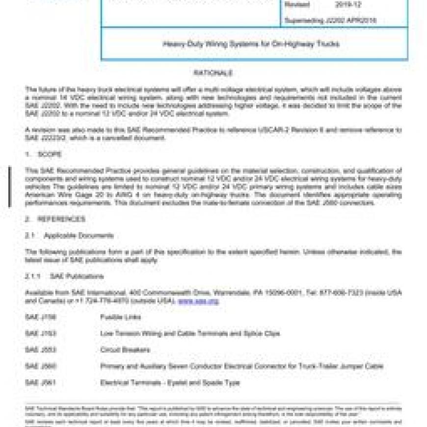 This SAE Recommended Practice provides general guidelines on the material selection, construction, and qualification of components and wiring systems used to construct nominal 12 VDC and/or 24 VDC electrical wiring systems for heavy-duty vehicles The guidelines are limited to nominal 12 VDC and/or 24 VDC primary wiring systems and includes cable sizes American Wire Gage 20 to AWG 4 on heavy-duty on-highway trucks. The document identifies appropriate operating performances requirements. This document excludes the male-to-female connection of the SAE J560 connectors.