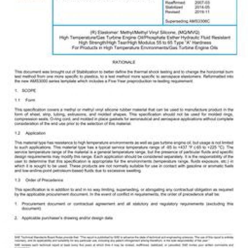 SAE AMS3306D Elastomer: Methyl/Methyl Vinyl Silicone, (MQ/MVQ) High Temperature/Gas Turbine Engine Oil/Phosphate Esther Hydraulic Fluid Resistant High Strength/High Tear/High Modulus 55 to 65 Type ¿¿¿A¿¿¿ Hardness For Products in High Temperature Environments/Gas Turbine Engine Oils