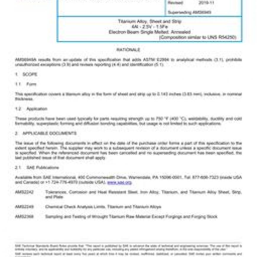 SAE AMS6949A Titanium Alloy, Sheet and Strip 4Al - 2.5V - 1.5Fe Electron Beam Single Melted. Annealed