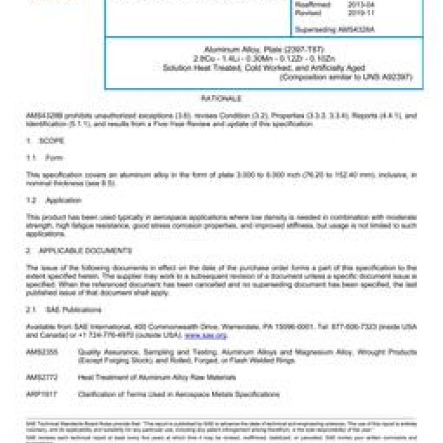SAE AMS4328B Aluminum Alloy, Plate (2397-T87) 2.8Cu - 1.4Li - 0.30Mn - 0.12Zr - 0.10Zn Solution Heat Treated, Cold Worked, and Artificially Aged