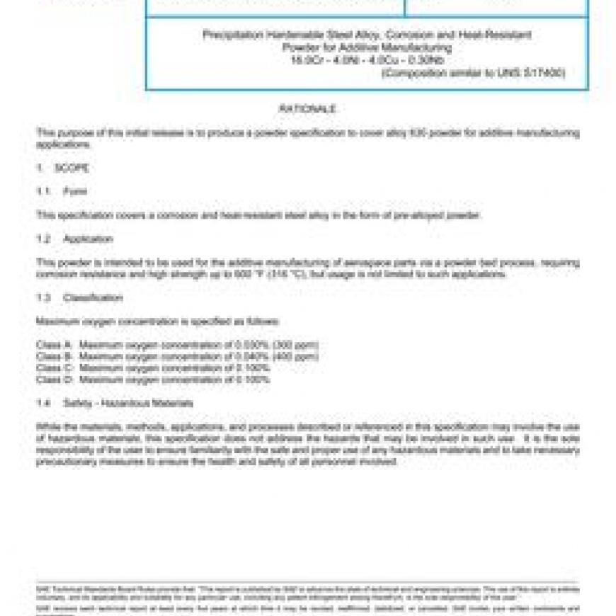 SAE AMS7012 Precipitation Hardenable Steel Alloy, Corrosion and Heat-Resistant Powder for Additive Manufacturing 16.0Cr - 4.0Ni - 4.0Cu - 0.30Nb