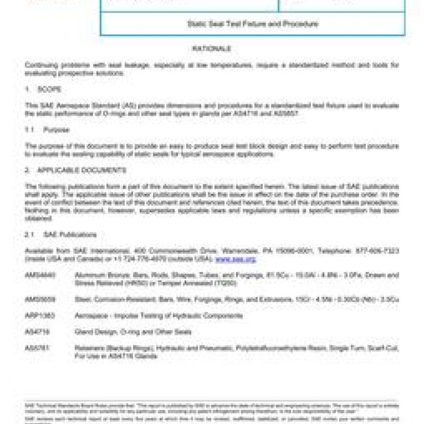 This SAE Aerospace Standard (AS) provides dimensions and procedures for a standardized test fixture used to evaluate the static performance of O-rings and other seal types in glands per AS4716 and AS5857.