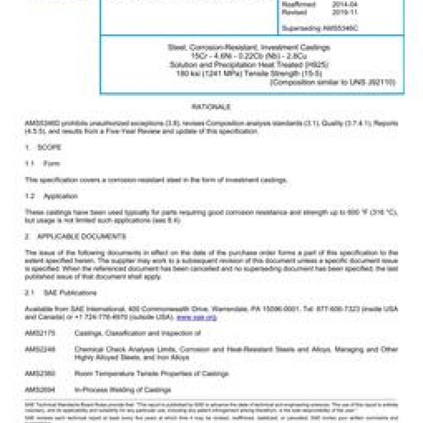 SAE AMS5346D Steel, Corrosion-Resistant, Investment Castings 15Cr - 4.6Ni - 0.22Cb (Nb) - 2.8Cu Solution and Precipitation Heat Treated (H925) 180 ksi (1241 MPa) Tensile Strength (15-5)