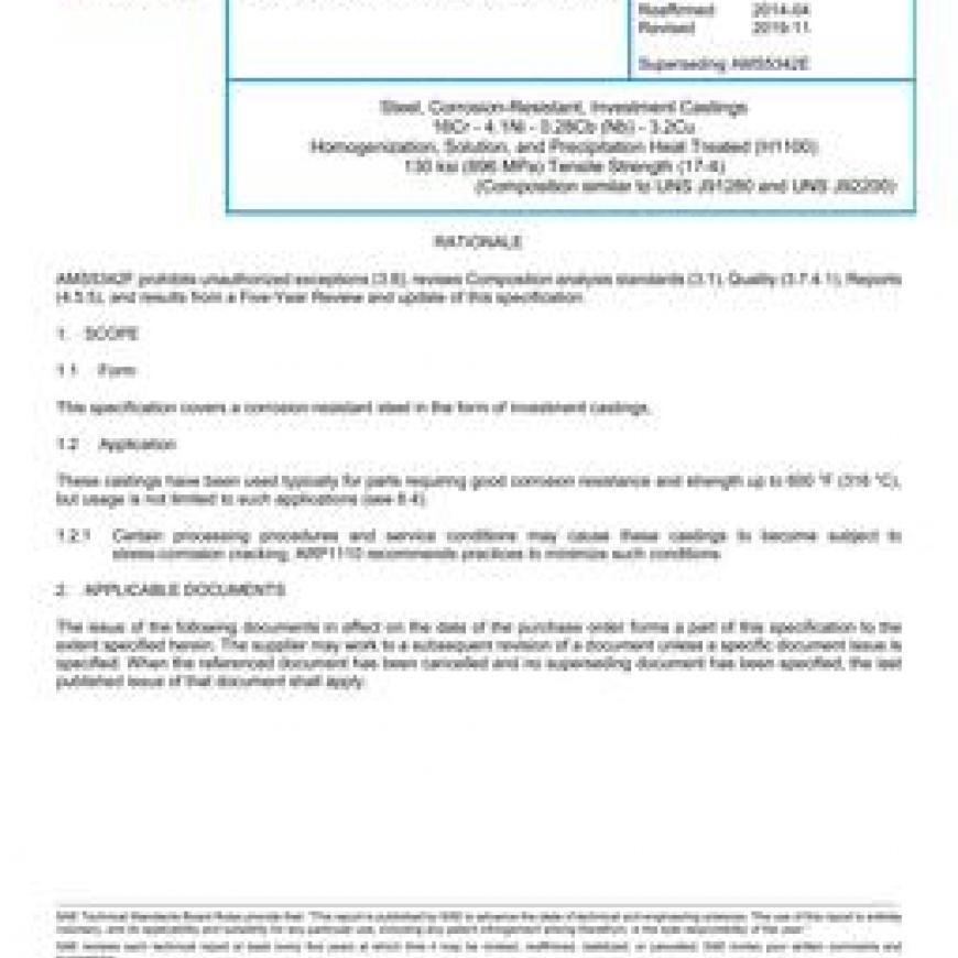 SAE AMS5342F Steel, Corrosion-Resistant, Investment Castings 16Cr - 4.1Ni - 0.28Cb (Nb) - 3.2Cu Homogenization, Solution, and Precipitation Heat Treated (H1100) 130 ksi (896 MPa) Tensile Strength (17-4)