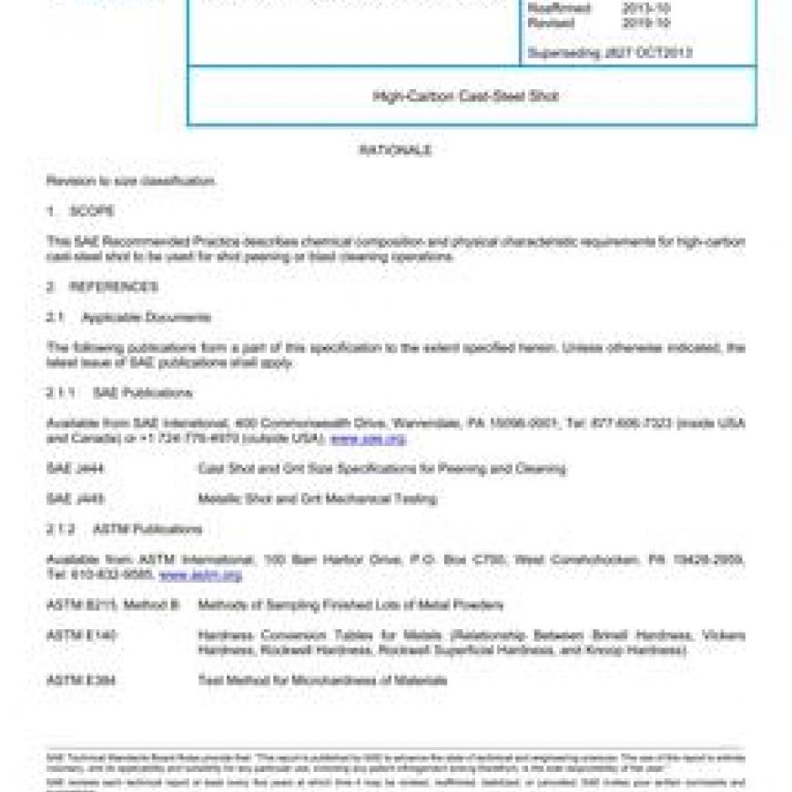 This SAE Recommended Practice describes chemical composition and physical characteristic requirements for high-carbon cast-steel shot to be used for shot peening or blast cleaning operations.