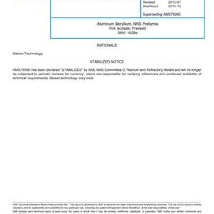 SAE AMS7909D Aluminum Beryllium, NNS Preforms Hot Isostatic Pressed 38Al - 62Be (Stabilized: Oct 2019)