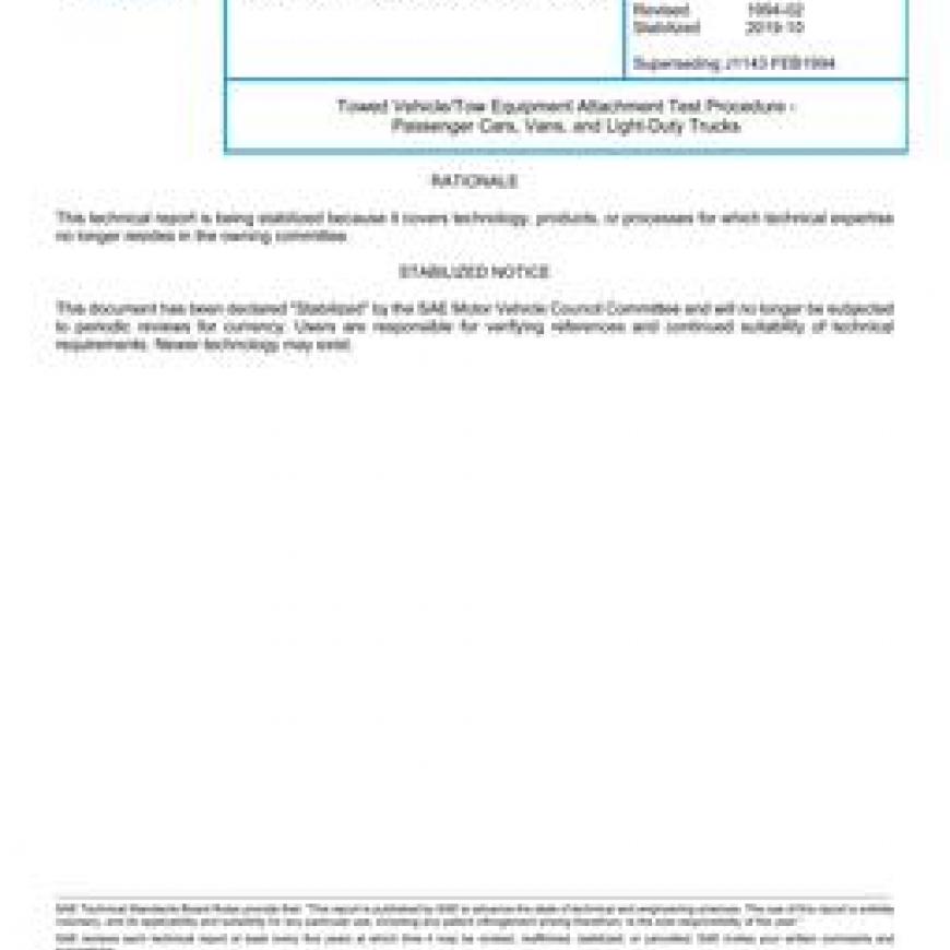 SAE J1143_201910 Towed Vehicle/Tow Equipment Attachment Test Procedure - Passenger Cars, Vans, and Light-Duty Trucks (Stabilized: Oct 2019)
