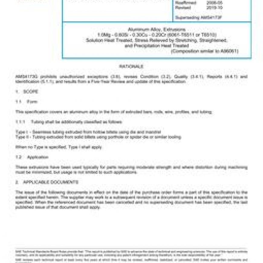 SAE AMS4173G Aluminum Alloy, Extrusions 1.0Mg - 0.60Si - 0.30Cu - 0.20Cr (6061-T6511 or T6510) Solution Heat Treated, Stress Relieved by Stretching, Straightened, and Precipitation Heat Treated